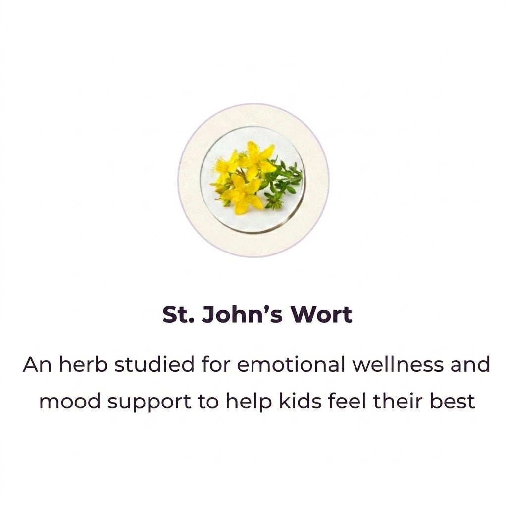 🌼 St. John's Wort A well-researched botanical that supports emotional balance and reduces irritability. It helps regulate mood naturally, making it easier for children to navigate the emotional ups and downs of their day.